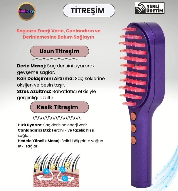 VeldaTech’in geliştirdiği Velda HairCRY, saç taramanın ötesine geçerek profesyonel bakım sunar. İyonize püskürtme motoru sayesinde bakım yağlarını saç derinize ulaştırır, titreşimli masaj motoru ile saç köklerinizi canlandırır. LED ışık terapisi desteği ve şık, ergonomik tasarımıyla saç bakım rutininize konfor ve yenilik katar.